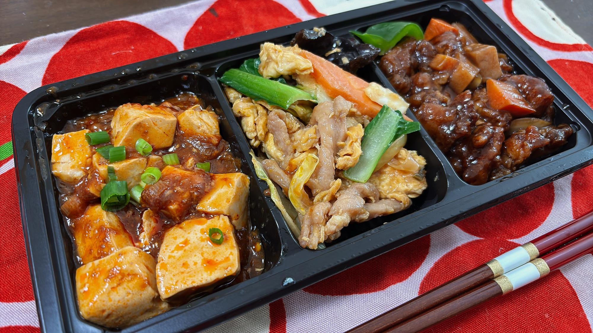 お家にご飯はあるしな…と思ったのでお惣菜のみテイクアウトしました。しかし、お惣菜のみでも数種類あってどれにしようか悩む…!海老チリは丼になっていて単体では無かったので選ばず。うーん、またの機会に食べよう…!辛いものを食べたい口になっていたので、麻婆豆腐・豚肉と卵の炒め物・の3点盛りにしました!