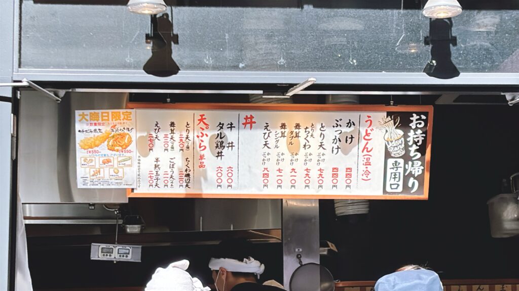 テイクアウト用のメニュー表は、お持ち帰り対応窓口の上部にあります。うどんのみ(かけ•ぶっかけ)は440円、天ぷら付きのうどんだと790円〜です。あとは丼もの2種類と天ぷら単品があります。