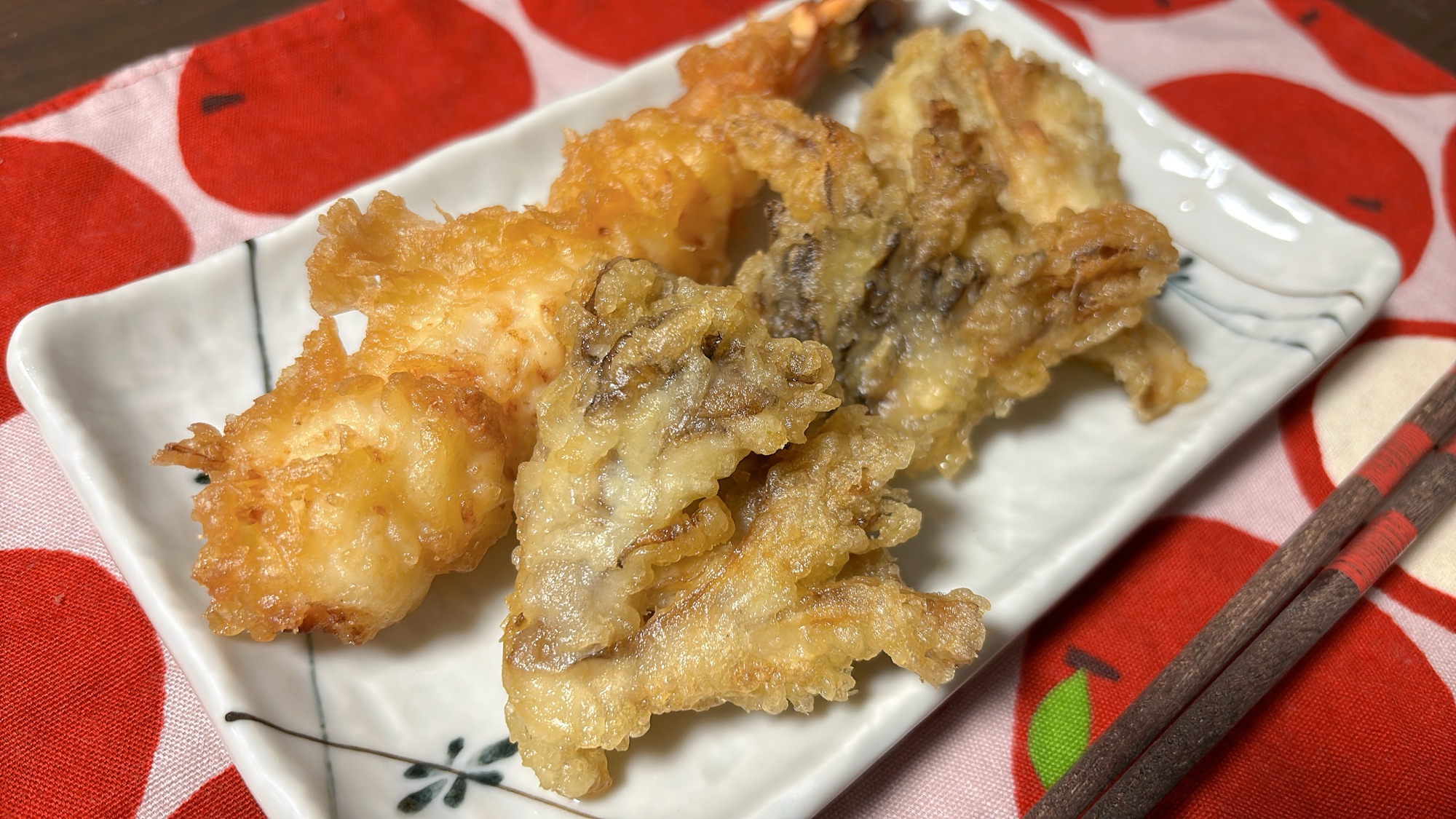 お次に舞茸天。プリッとしつつも若干コリっと食感がありました!きのこがきっちり集まるように揚げられていたので、一口食べた時の舞茸密度が高い!舞茸の味が濃く感じられました♪