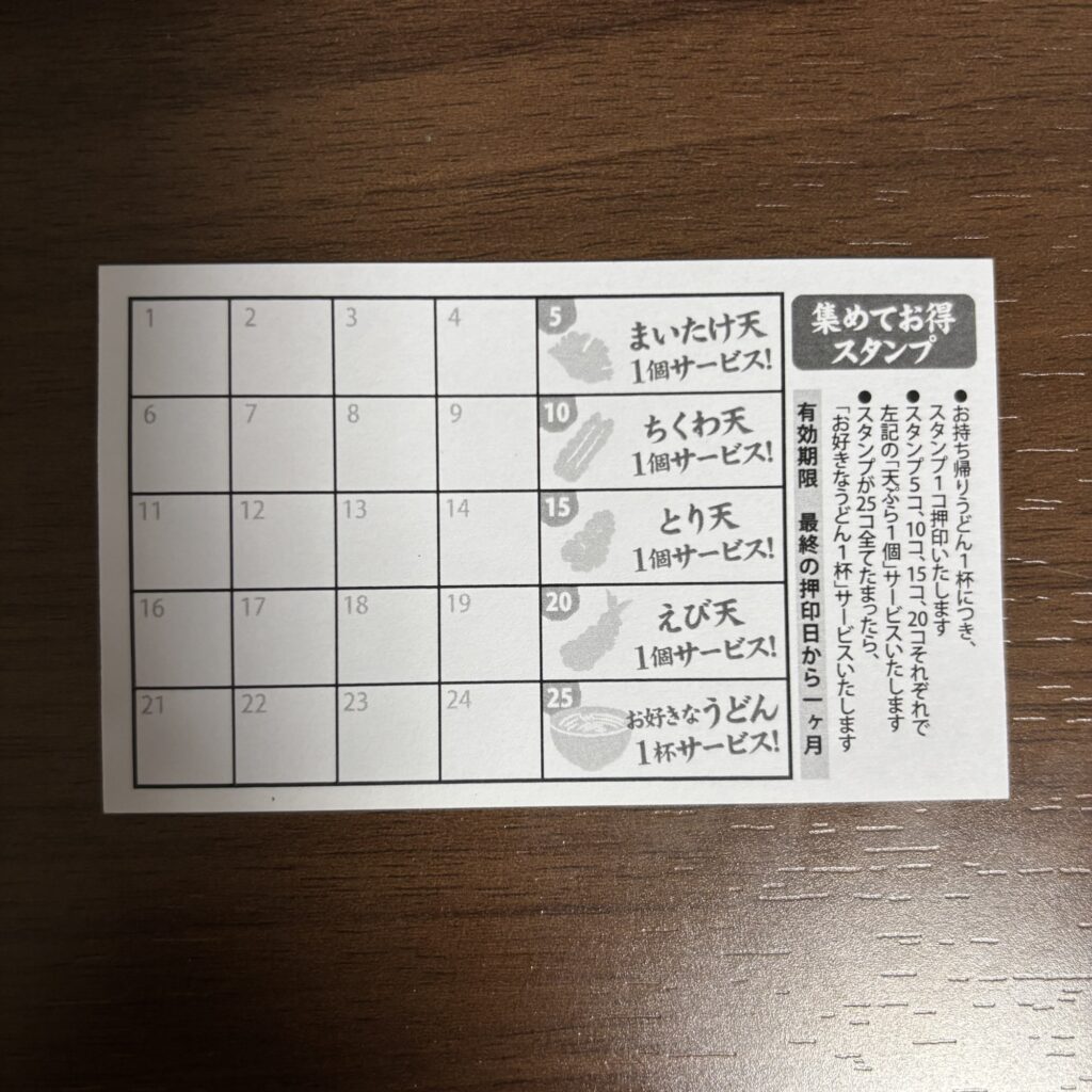テイクアウト専用窓口にスタンプカードが置いてあったのでもらいました。スタンプはうどん一杯につき1つ押印してくれるそう。有効期限を見ると、「最終の押印日から1か月」?!一人だとかなりのいぶきうどんヘビーユーザーになるのでは?!でも天ぷらやうどんサービスのためについつい頑張っちゃうかもね