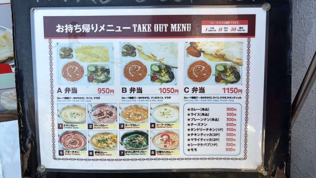 お弁当メニューはA弁当(カレー1種類+ライス+サラダ)950円、B弁当(カレー1種類+ナン&ライス+サラダ)1050円、C弁当(カレー種類+ライス&ナン、+サラダ+チキンティッカ)1150円の3種類。