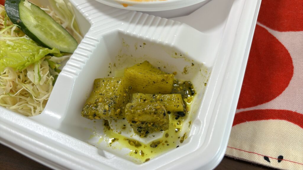 あと食べかけで申し訳ないですが、緑の謎の漬物?語彙が貧弱で味の説明がうまくできませんが、美味しかったです。